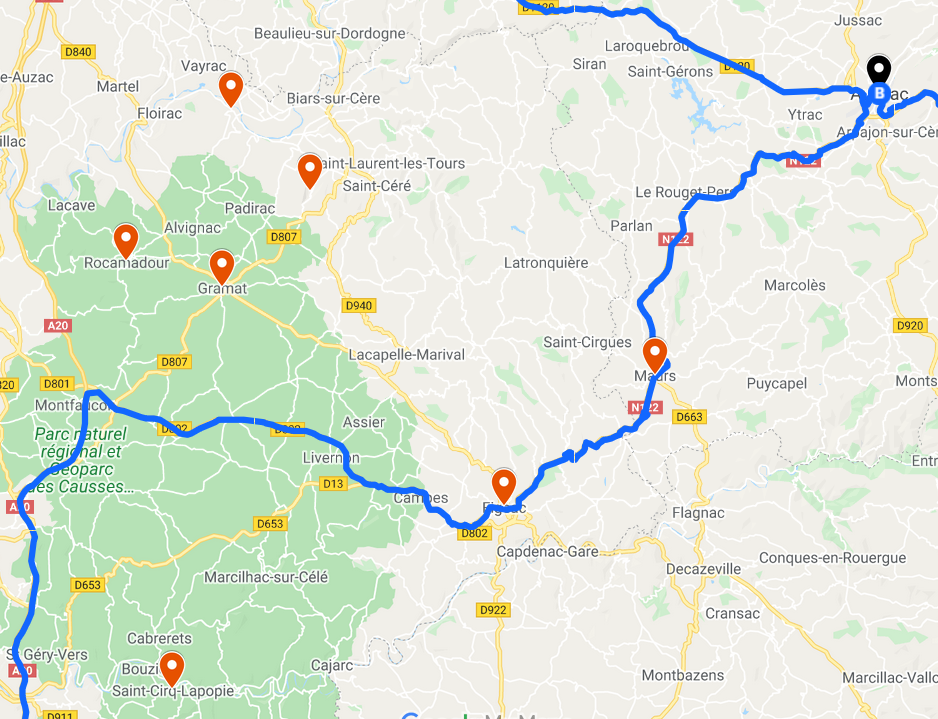 Carennac, Autoire, Gramat, Rocamadour, Maurs, Figeac, Saint-Cirq-Lapopie.