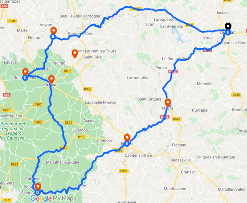 - Saint-Cirq-Lapopie – Aurillac, par Figeac et Maurs (110 km, 2h)