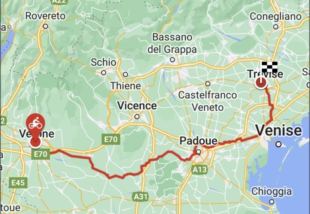 Départ de Vérone sous un ciel chargé. On aura un peu de pluie sur la route, direction Trévise.