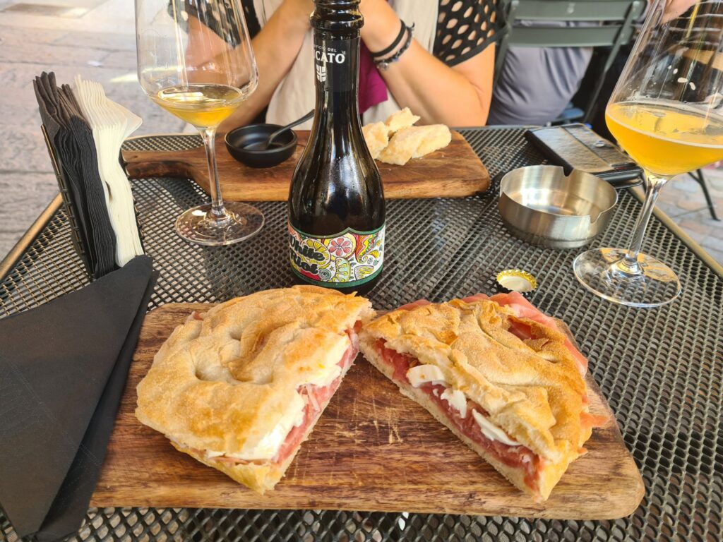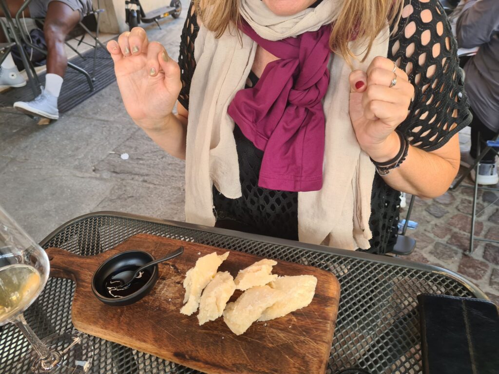 Vers quinze heure, petite faim. Sandwich local (j’ai choisi le petit modèle 😅) au jambon de Parme et mozzarella, et Florence goûte avec une planche de parmesan au vinaigre balsamique. Une tuerie gustative !