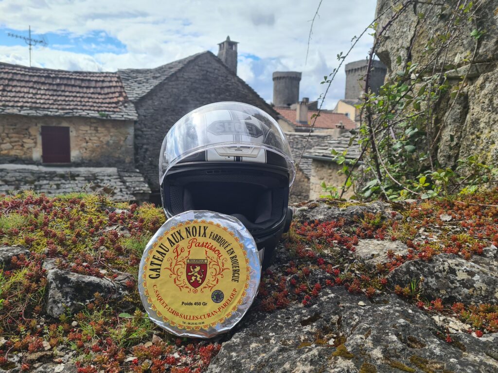 Ensuite on fait un beau détour et on file à la Couvertoirade, qu’on visite. Un gâteau au noix pour Florence finira dans la sacoche !