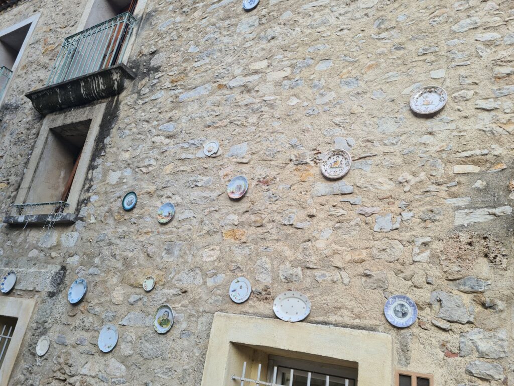 On arrive à Saint-Guilhem-le-désert en fin d’après-midi. On s’installe dans le gîte. Une balade rapide dans la ville et bon repas au restaurant, dont la façade est décorée d’assiettes !