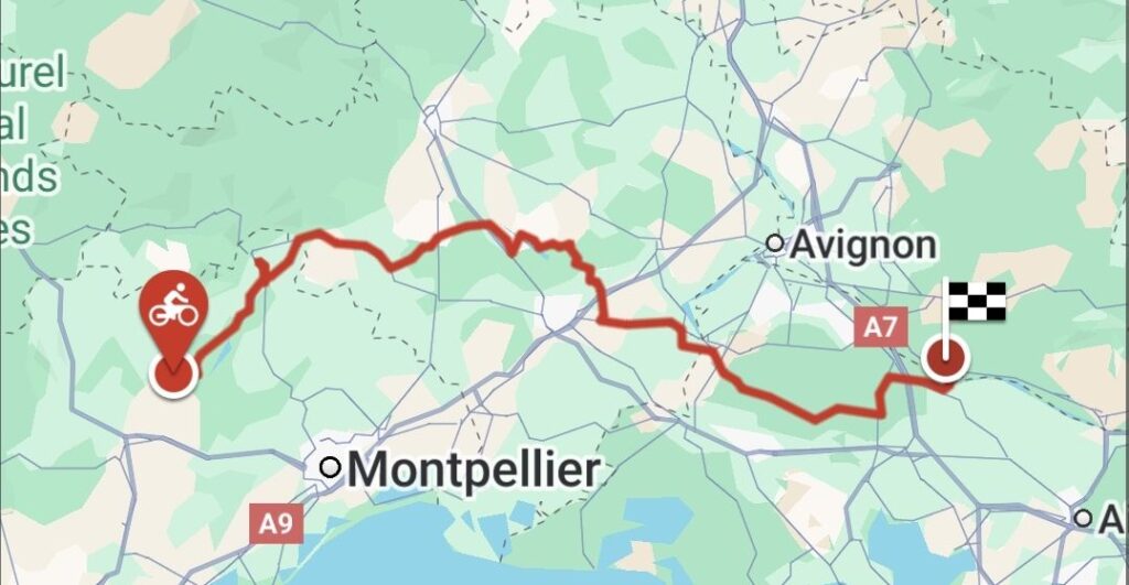 On se séparera à Eyguières. Il nous reste moins de trente kilomètres pour rentrer. On arrivera après deux cent kilomètres et ce n’est qu’une fois arrivés qu’il pleuvra un peu : on sera restés secs ! C’est Frédérique qui sera la plus mouillée car elle prendra un gros orage avant d’arriver chez elle.