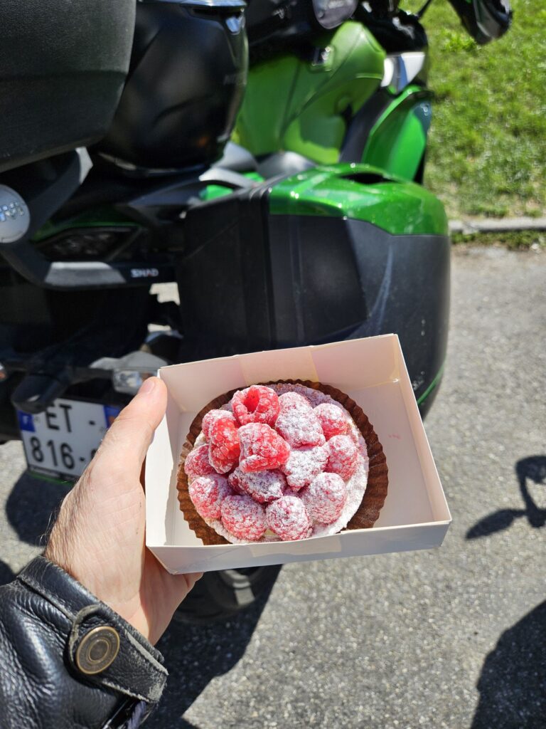 Un petit arrêt rapide toutes les heures pour se dégourdir les jambes, histoire de couper le rythme. Vers midi on stoppe à Savine le lac pour faire quelques emplettes pour le déjeuner. C’est plein de motards ! Je commence par le dessert 🤪