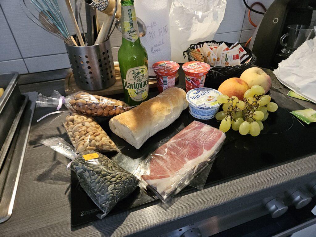 Un tour au marché pour faire le plein de produits locaux pour manger. Le jambon est une tuerie, le fromage une catastrophe, le pain se défend, les fruits sont frais.