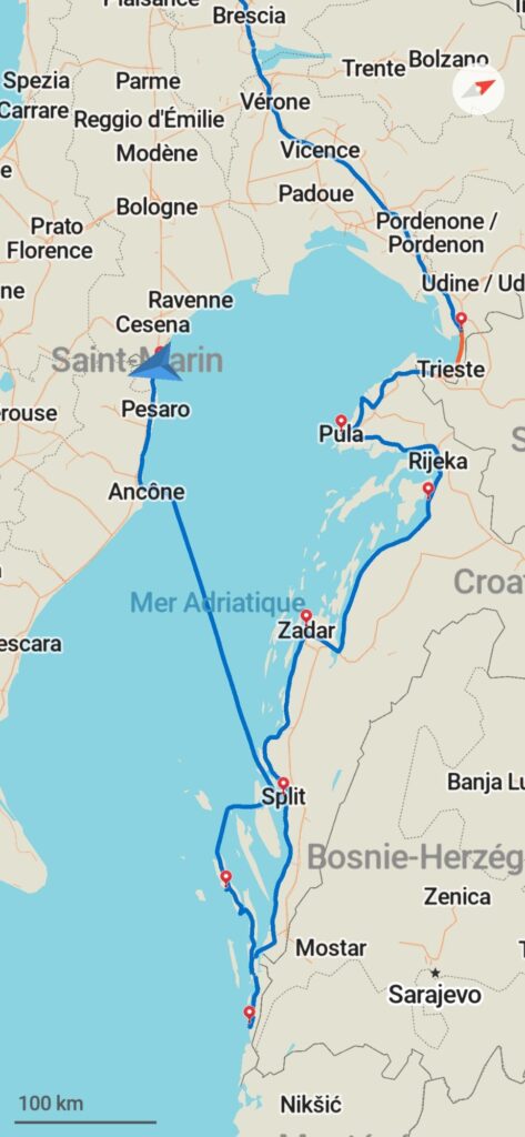 La nuit a été hachée et peu reposante. A huit heures, on débarque, on prend un petit déjeuner rapide et on monte vers le nord, direction Rimini. Peu de kilomètres pour aujourd’hui.