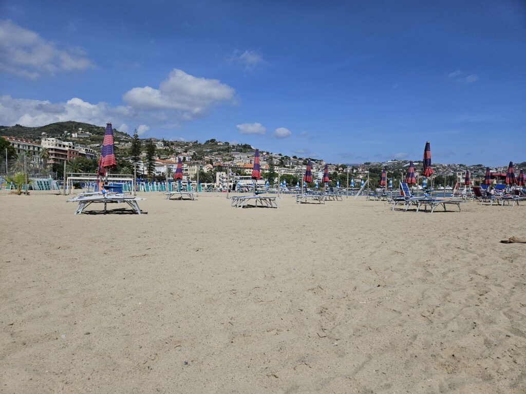 Arrivée à Sanremo à midi. On se pose à l’hôtel et zou, à la flotte. J’ai un peu de mal avec le système des plages privées en Italie avec leur parasol/transat.